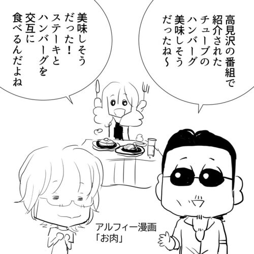 【THEALFEE】『高見沢俊彦の美味しい音楽美しいメシ★チューブおすすめ!ハンバーグをアテにステーキを食らう最強コンボに高見沢さんも絶賛!』アルフィー漫画イラストマンガ